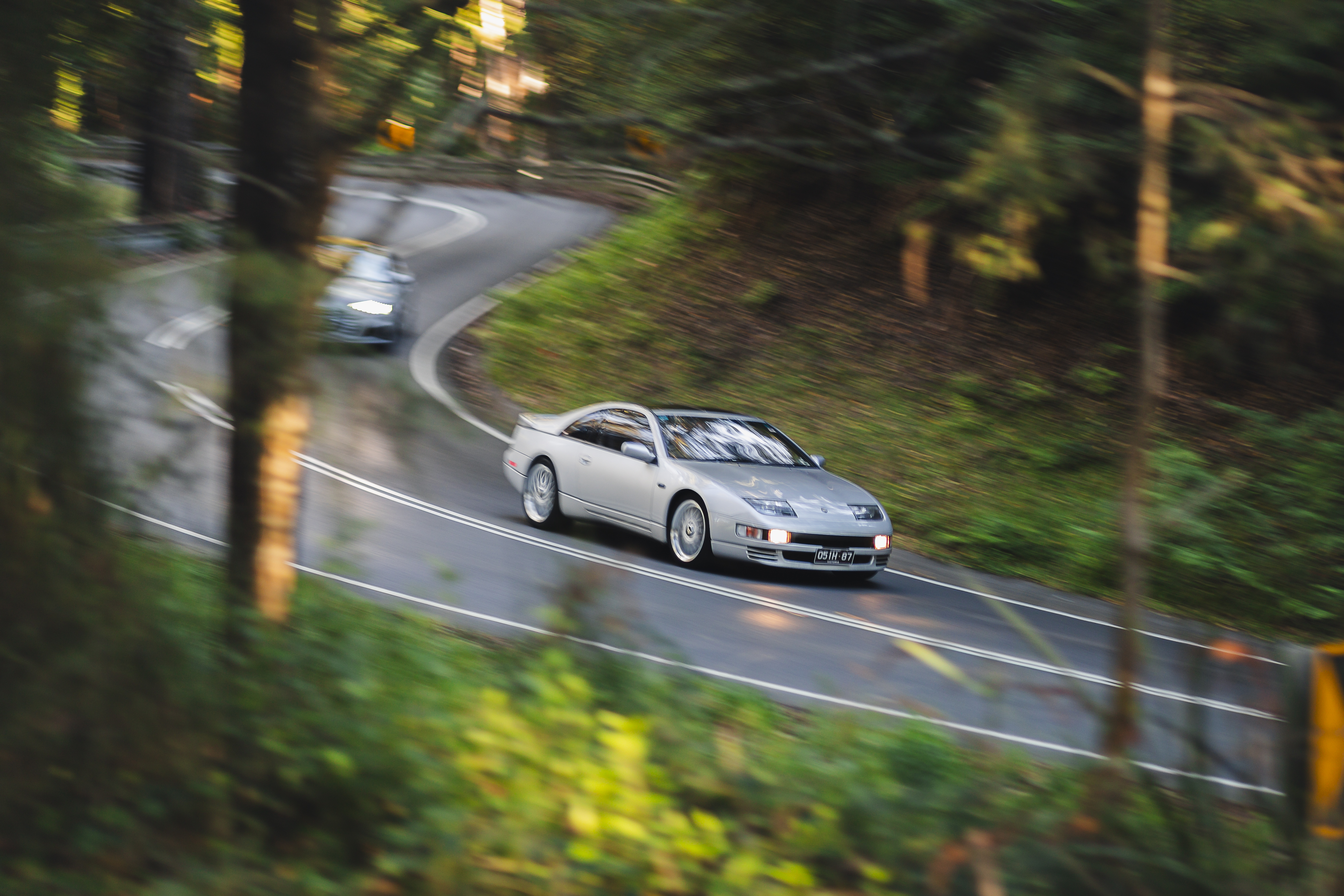Silver coupe curves through woodland road