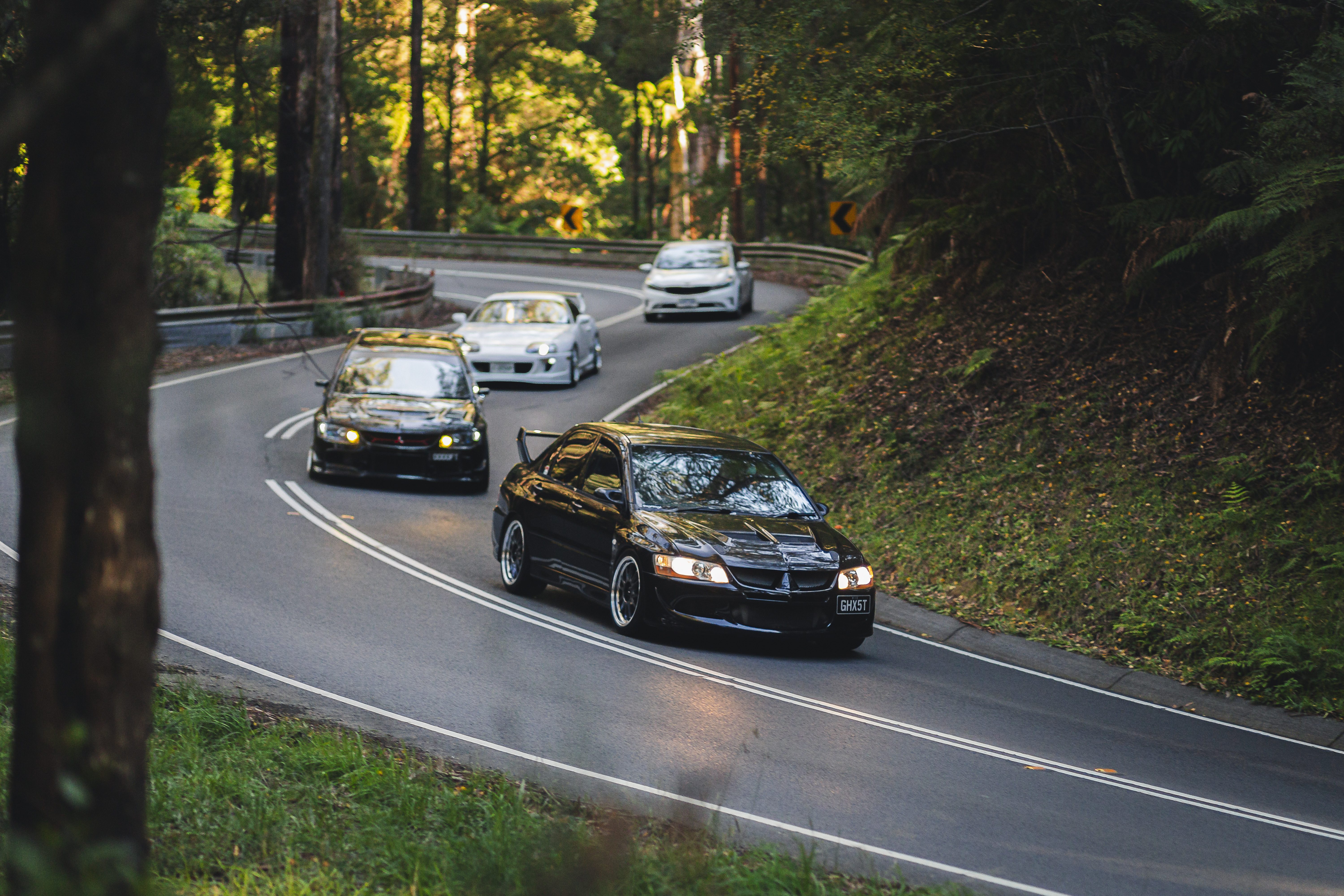 Three cars navigate a forested road lined with tall trees and dense green vegetation.