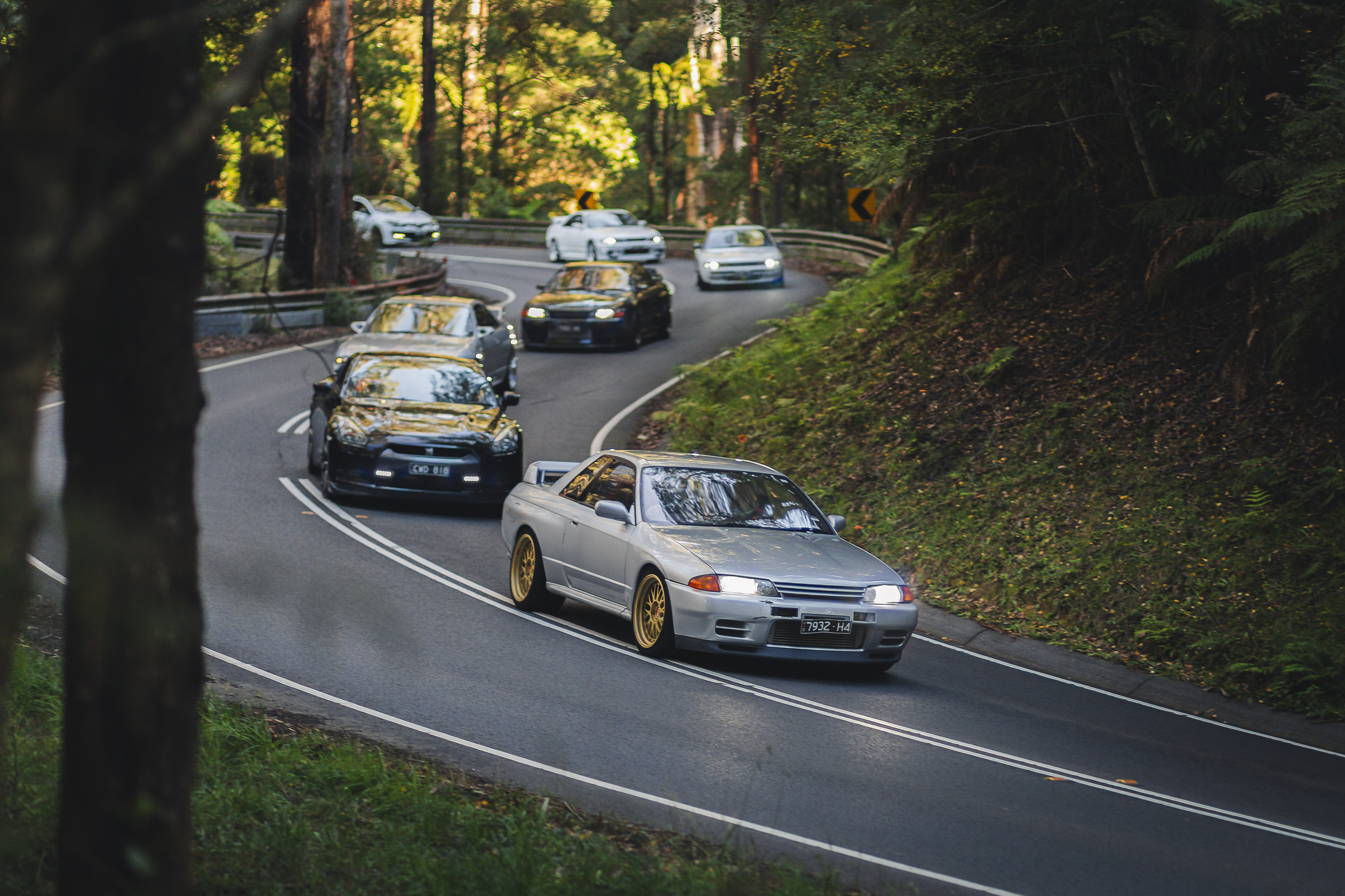A convoy of sports cars navigates a winding forest road lined with tall trees and dense vegetation.