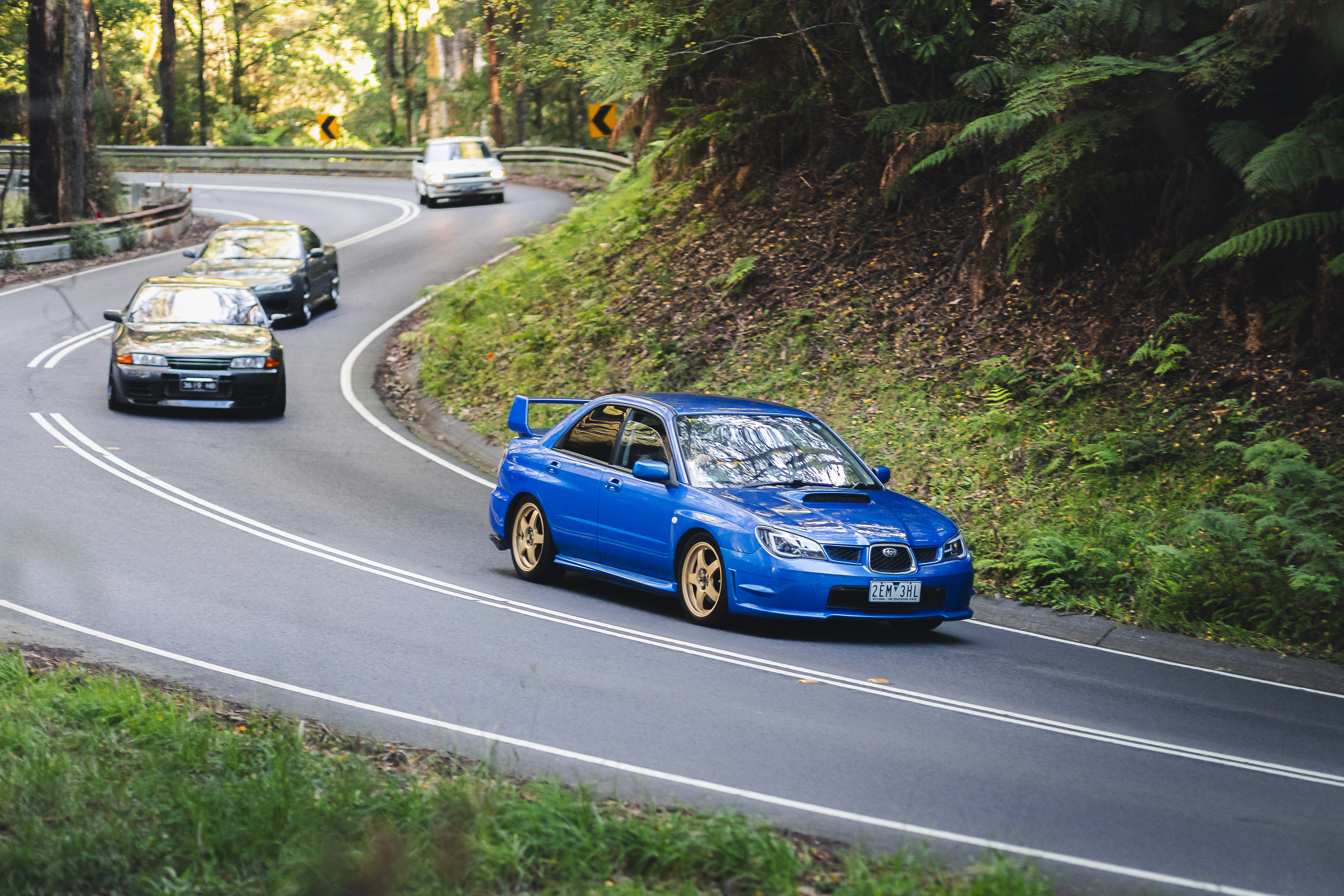 Blue sedan with gold wheels leads a convoy of vehicles through a forested mountain road with tight curves.