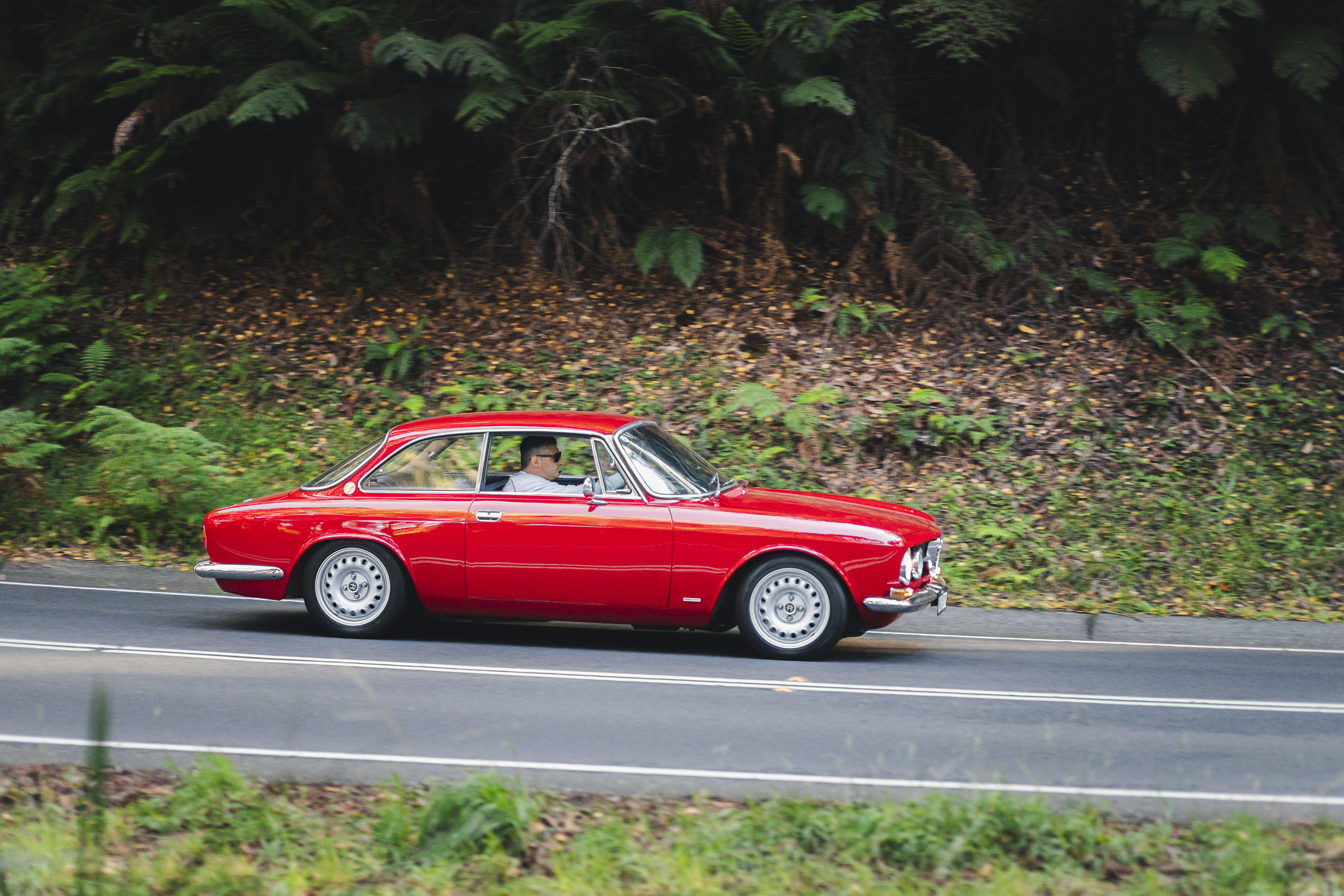 Red vintage sedan driving on a paved road with dense green forest and foliage in the background.