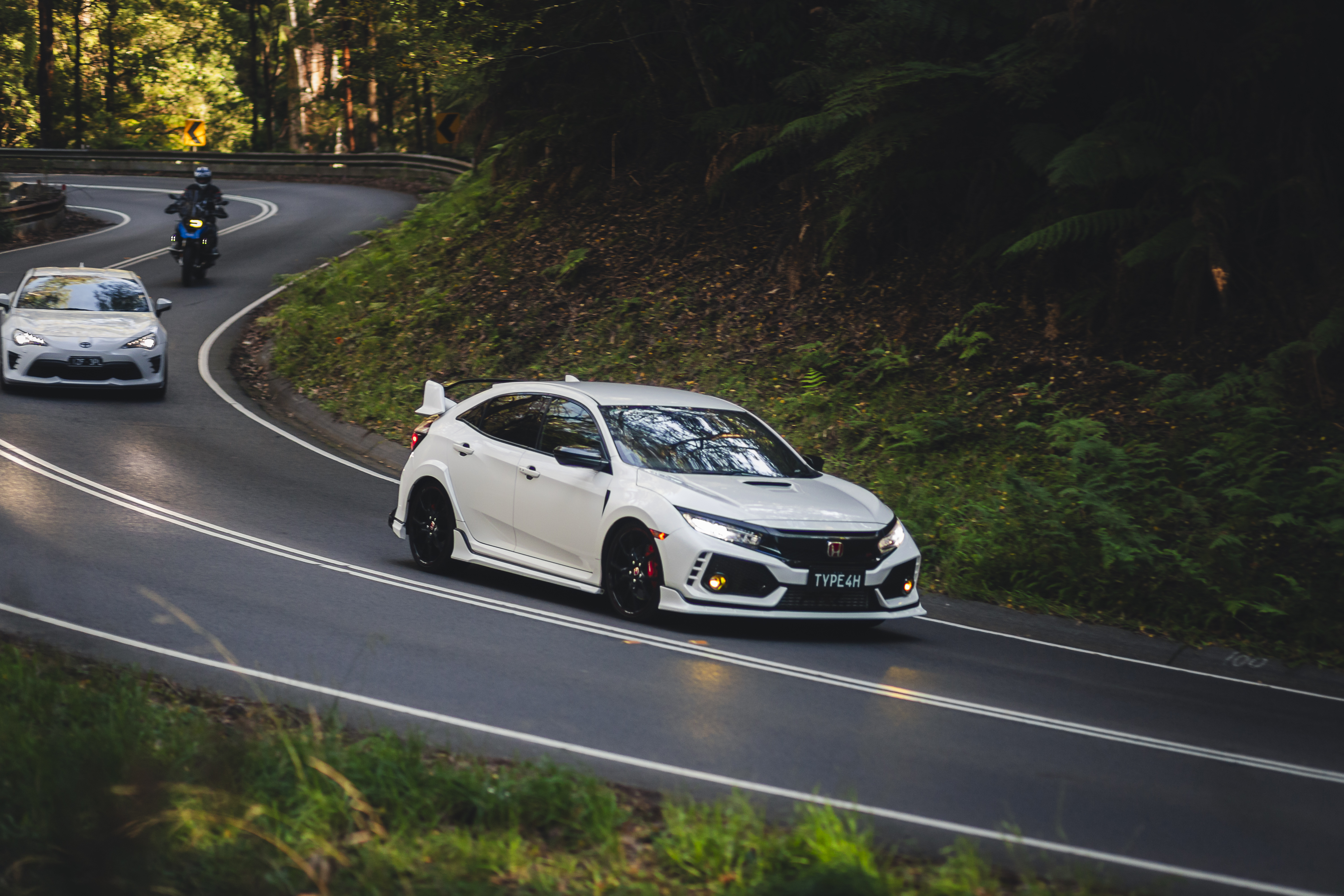 White hatchback with red accents navigates a curved mountain road lined with dense green forest, followed by other vehicles.
