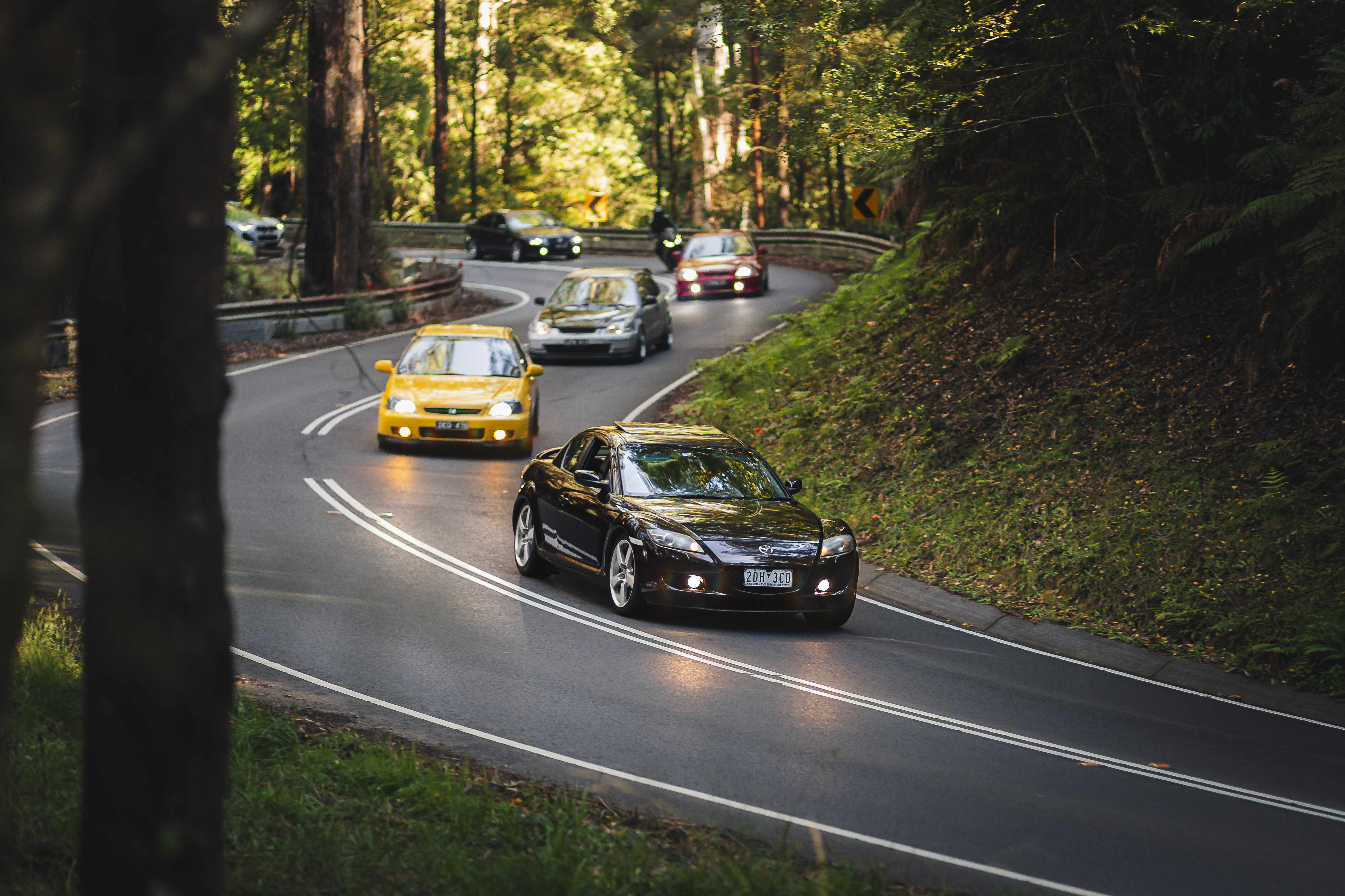 A black sports car leads a convoy of vehicles through a winding forest road lined with tall trees.