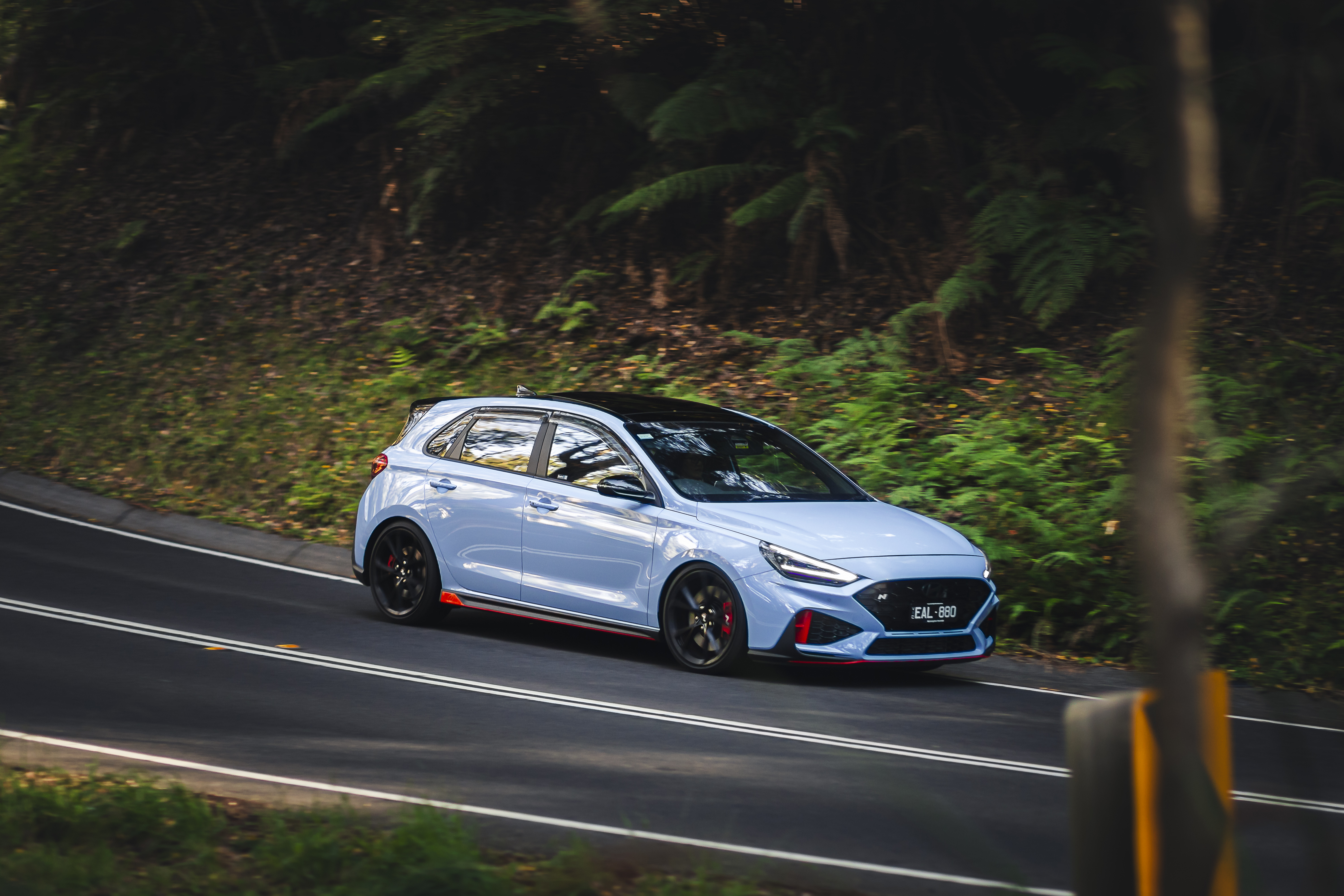 Light blue hatchback with red accents on a winding forest road with trees and undergrowth in the background.
