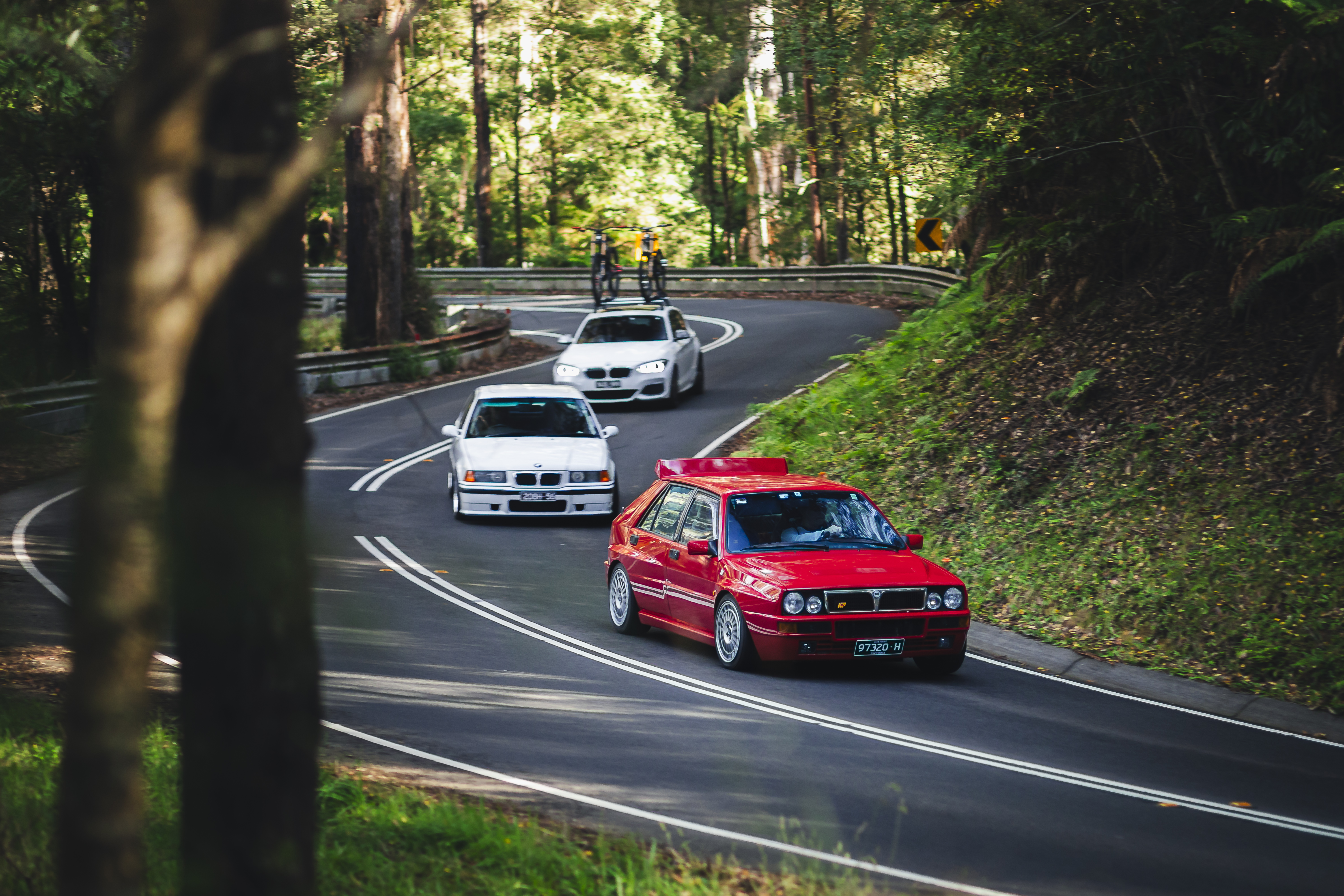 Three performance cars navigate a tree-lined mountain road in single file, with a red compact sports car leading two white sedans through a sweeping curve.