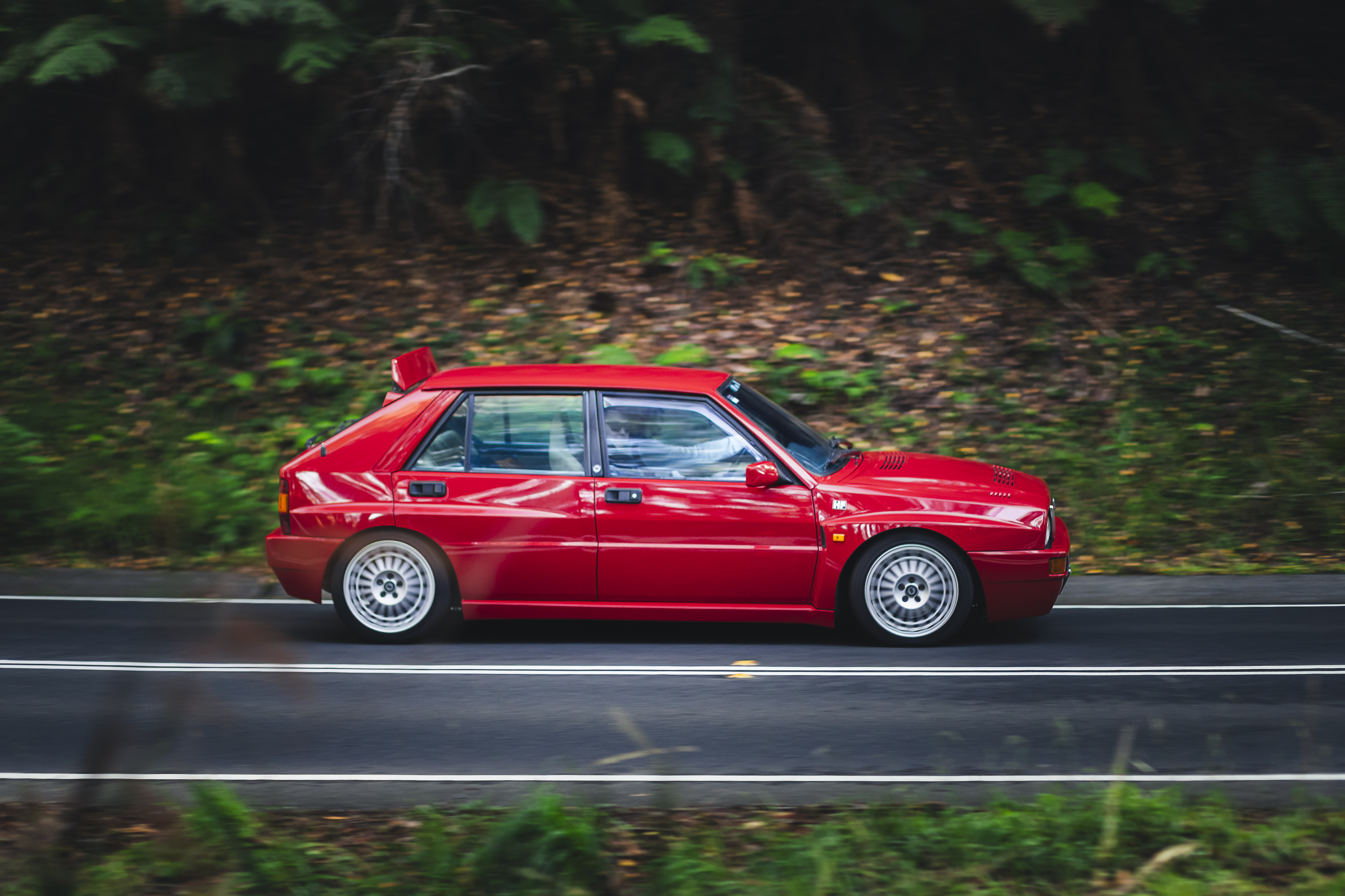 Red compact sedan driving on a two-lane road bordered by dense green forest.