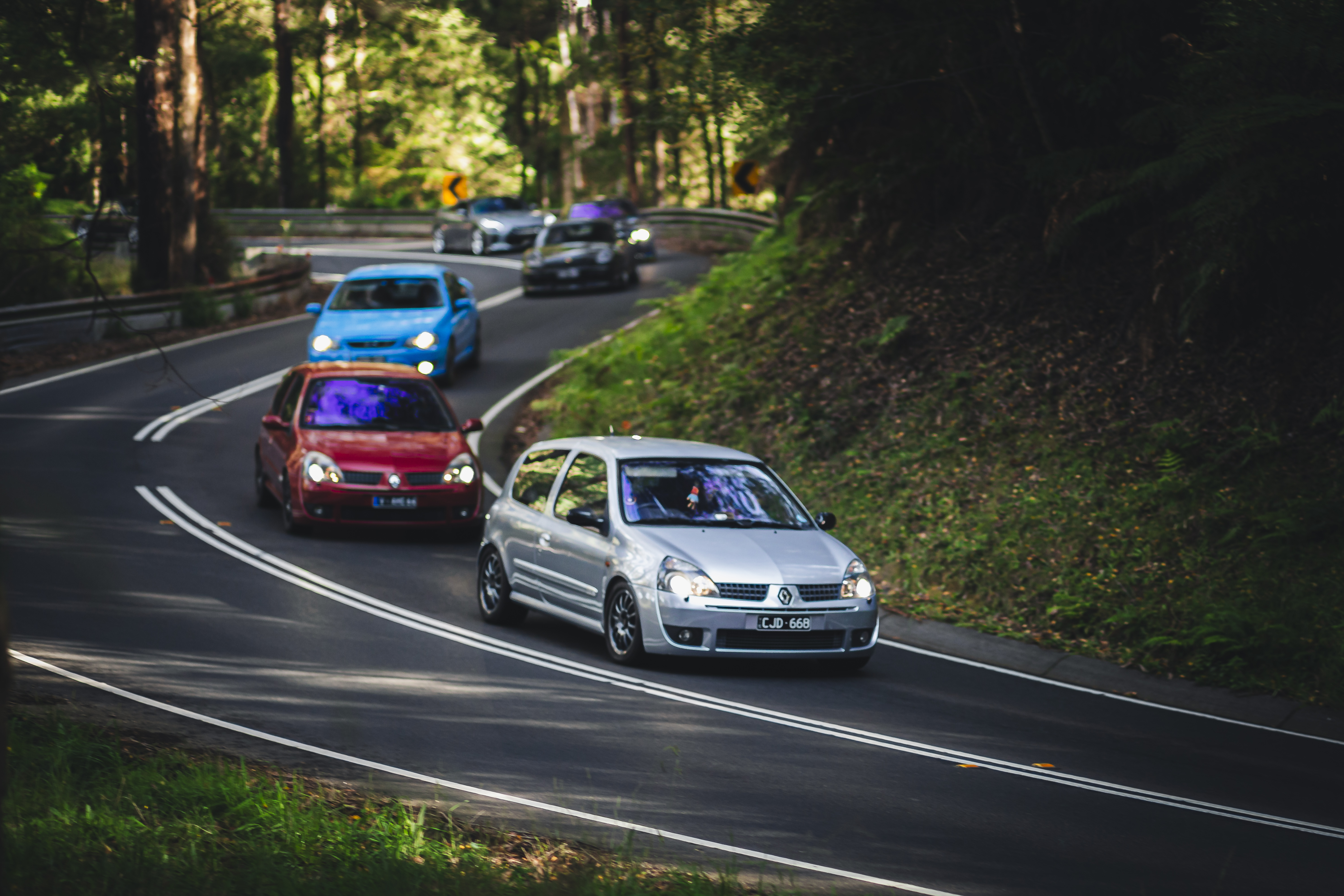 A silver Volkswagen Golf leads a convoy of compact cars through a forested road with lush green vegetation on both sides.