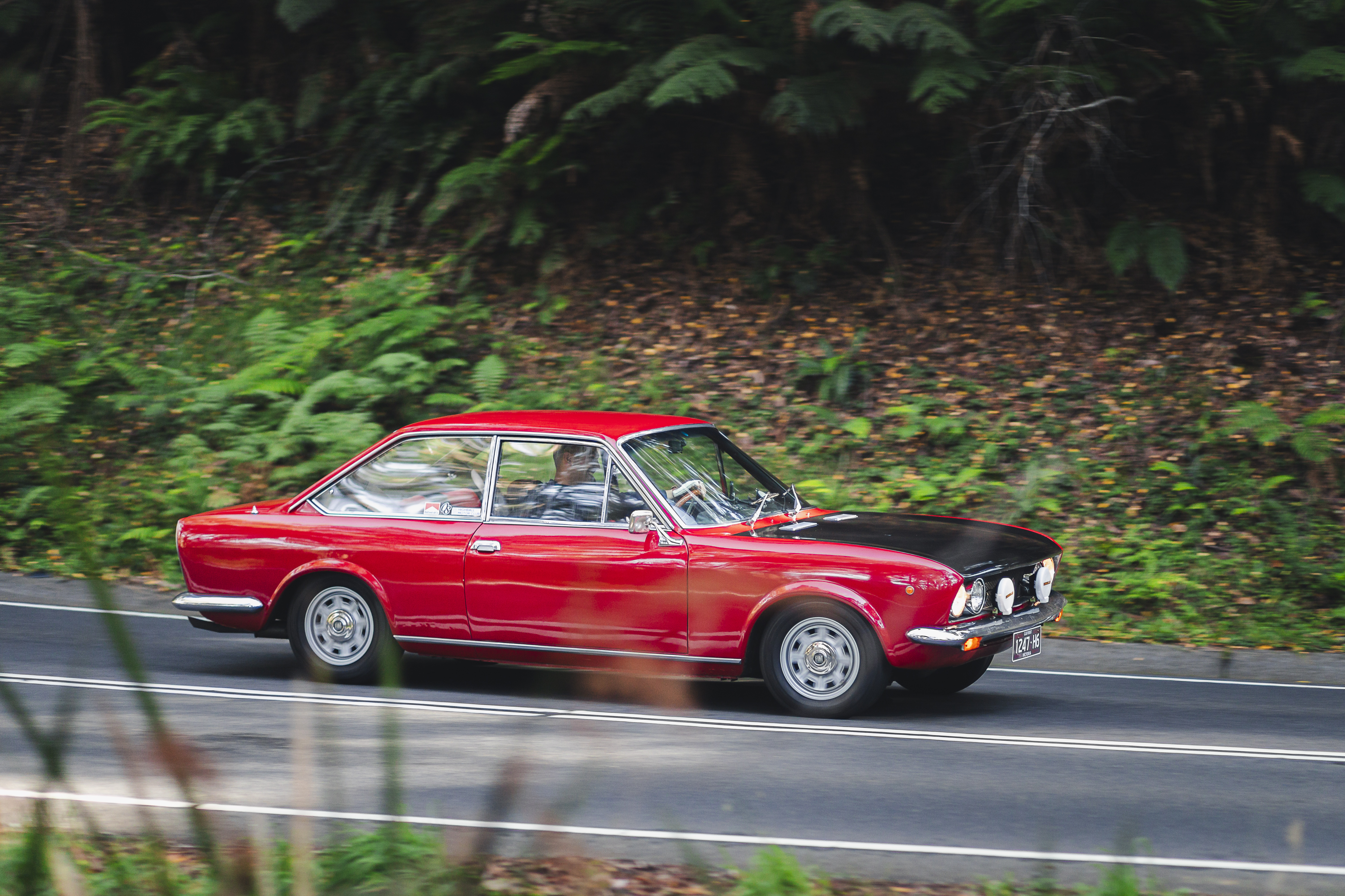 Red vintage coupe with auxiliary lights driving along a forest road lined with dense green foliage.
