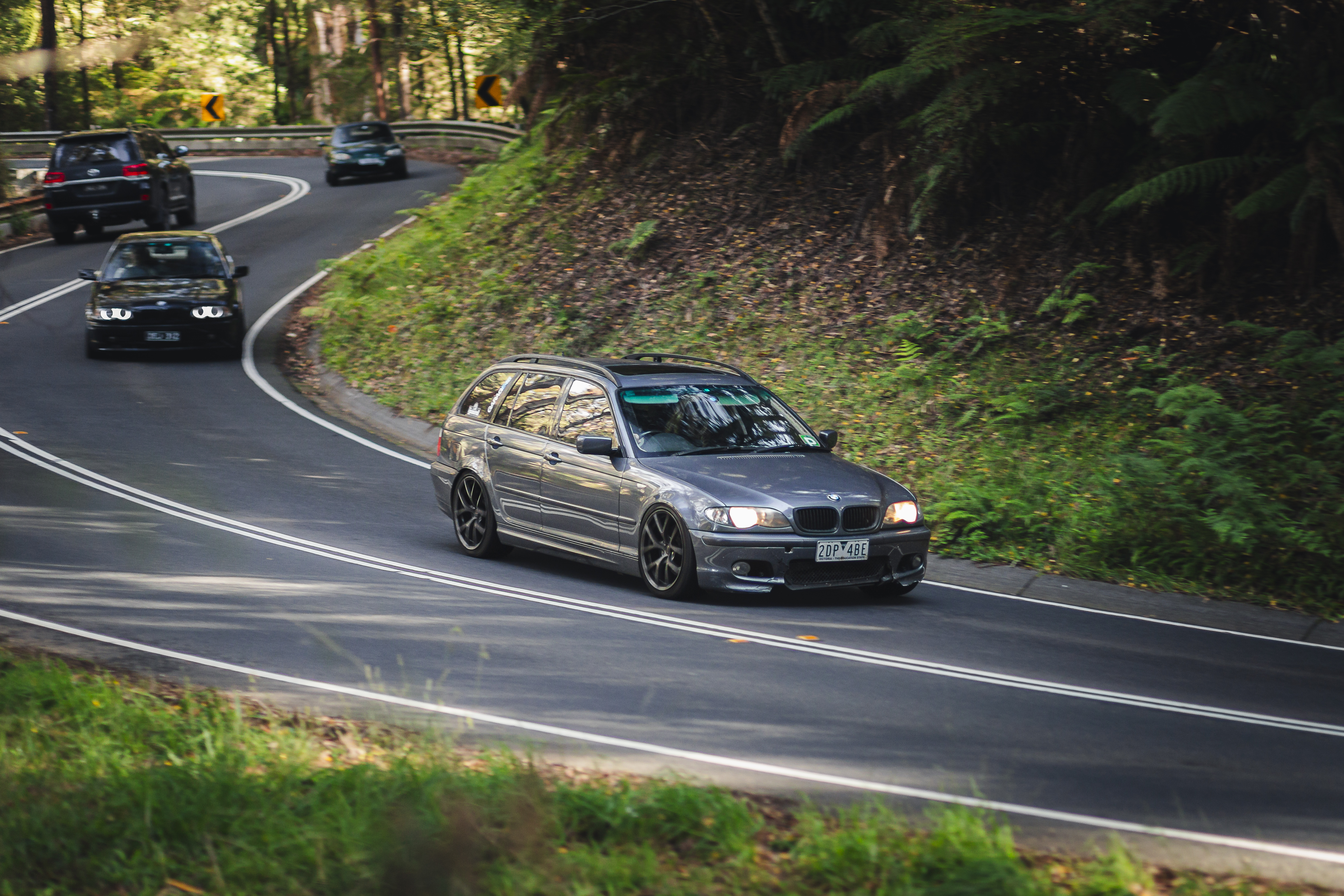 Silver sedan leading a group of cars through a wooded mountain road with tight curves and lush green vegetation.