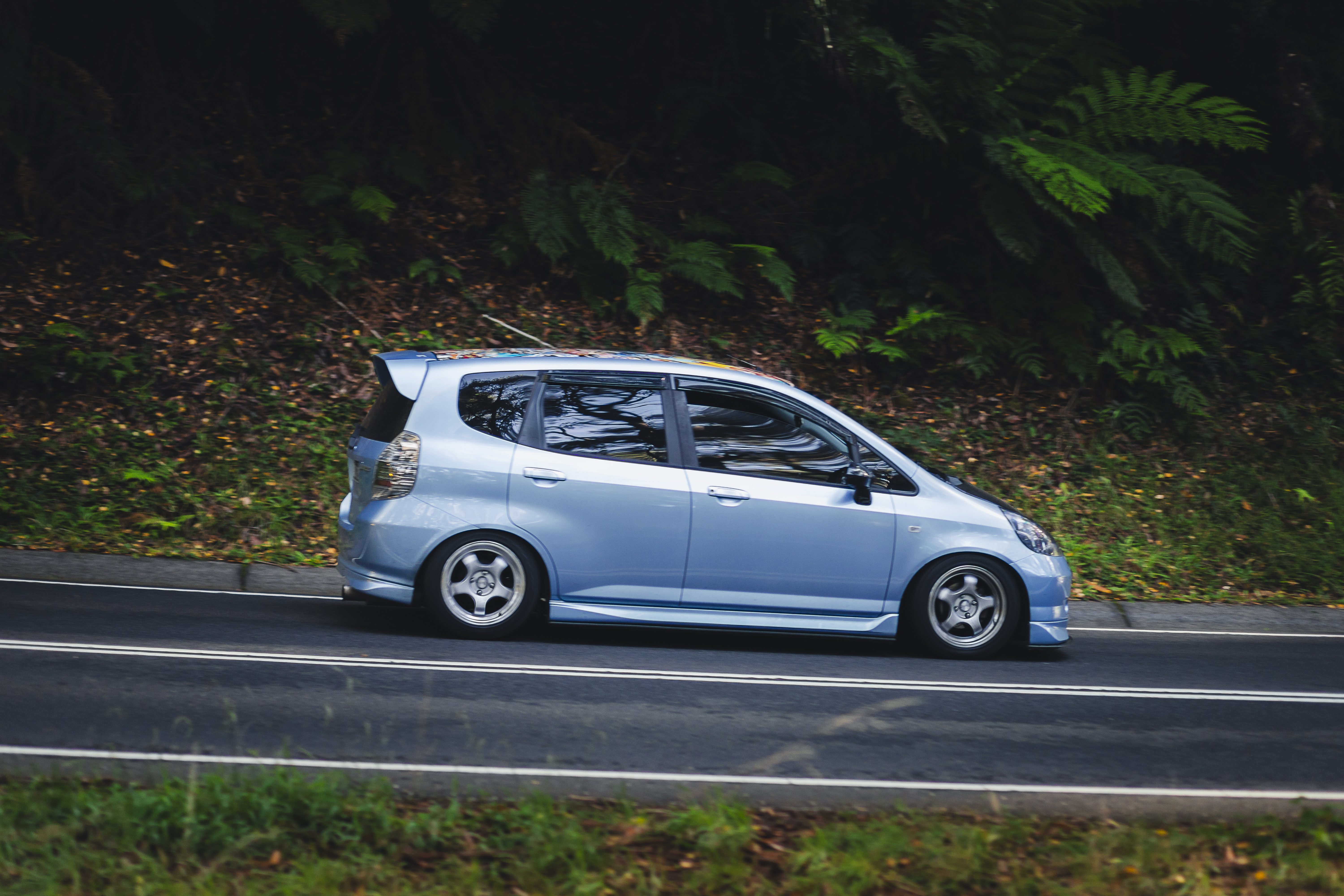 Light blue modified compact hatchback driving on a road with dense forest foliage in the background.