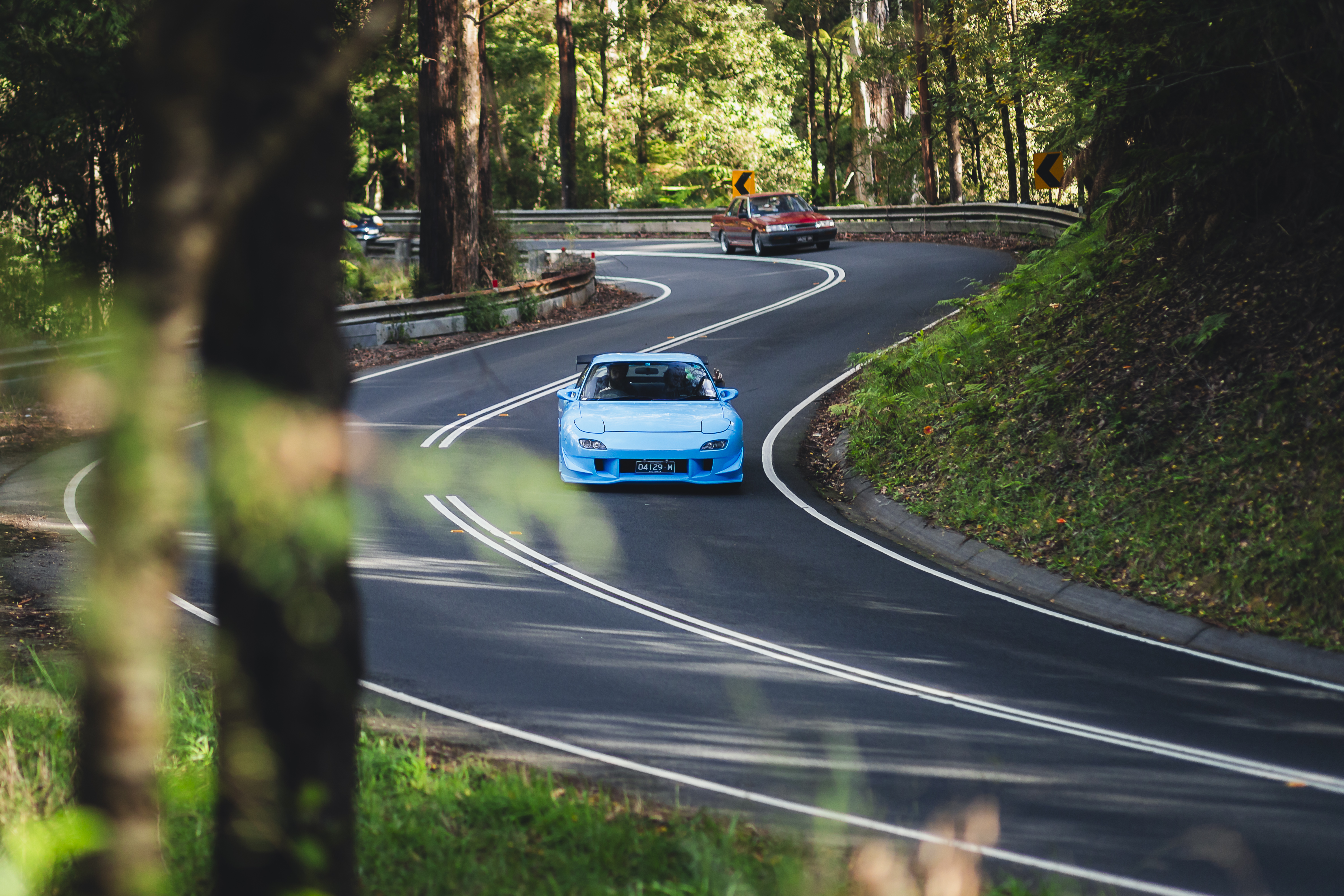 Blue coupe carving through forest curves