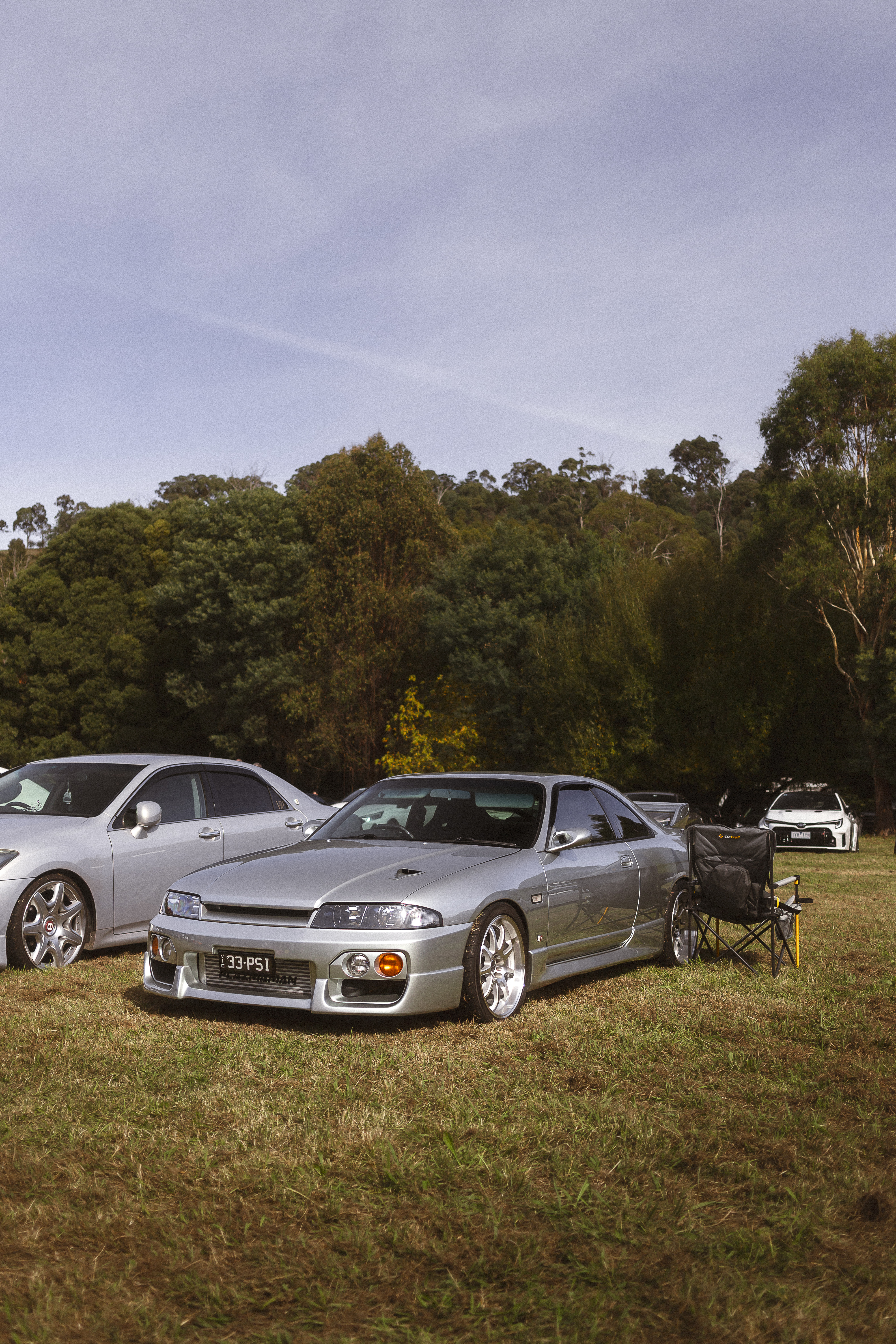 Modified silver coupe at grassland gathering