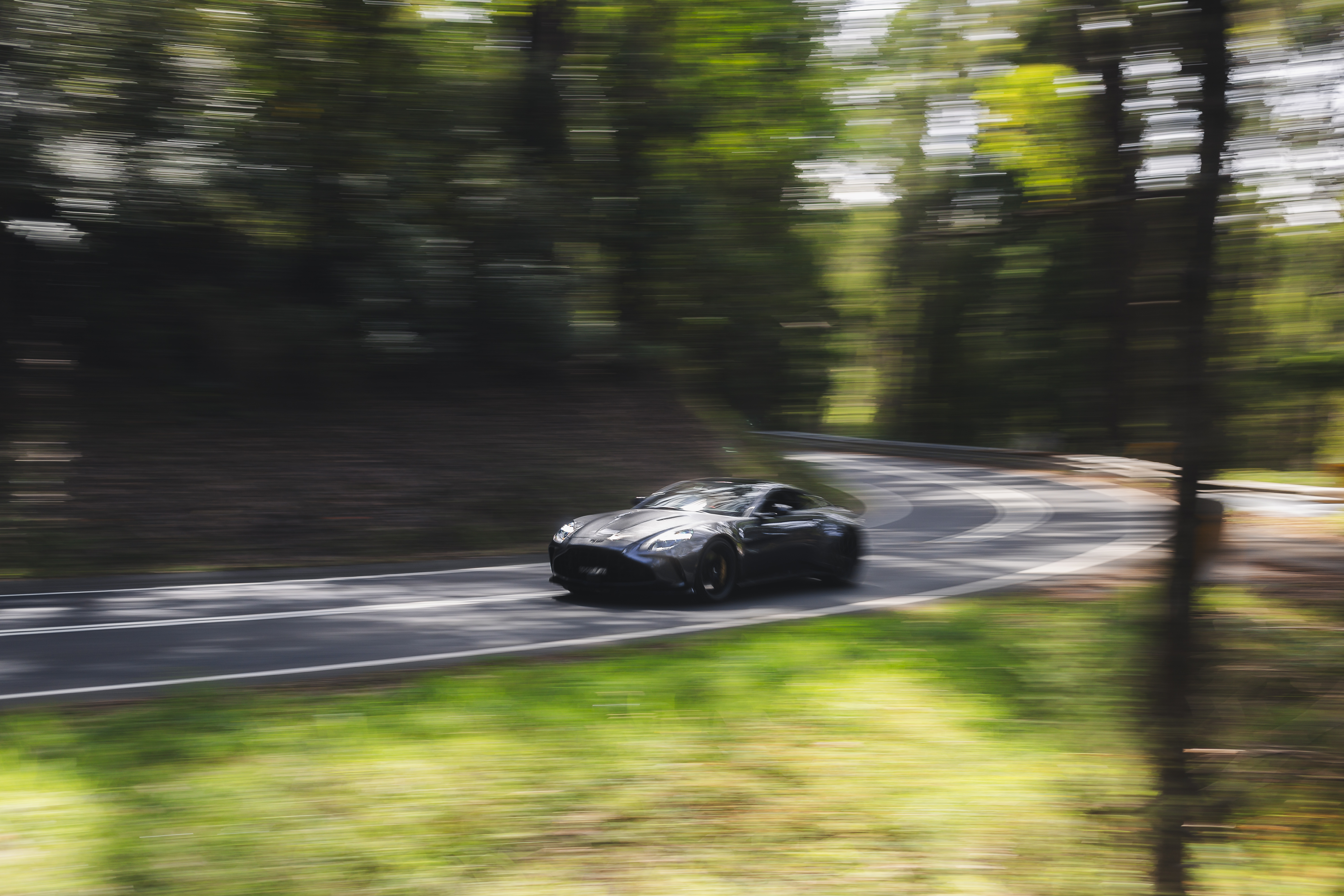 Dark sports car driving on a tree-lined road with motion blur surrounding the vehicle.