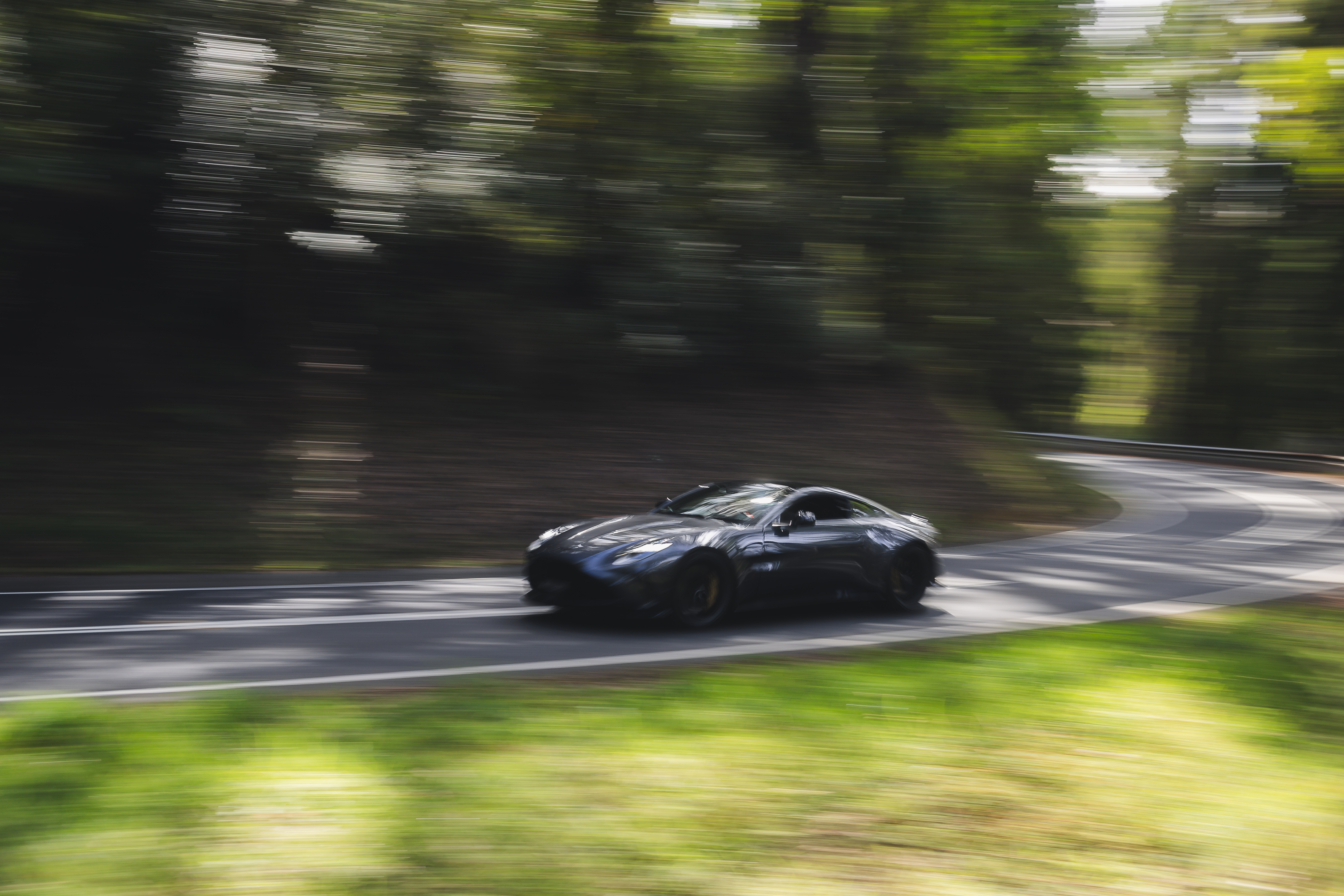A dark-colored sports car drives along a tree-lined road with motion blur in the background and foreground.