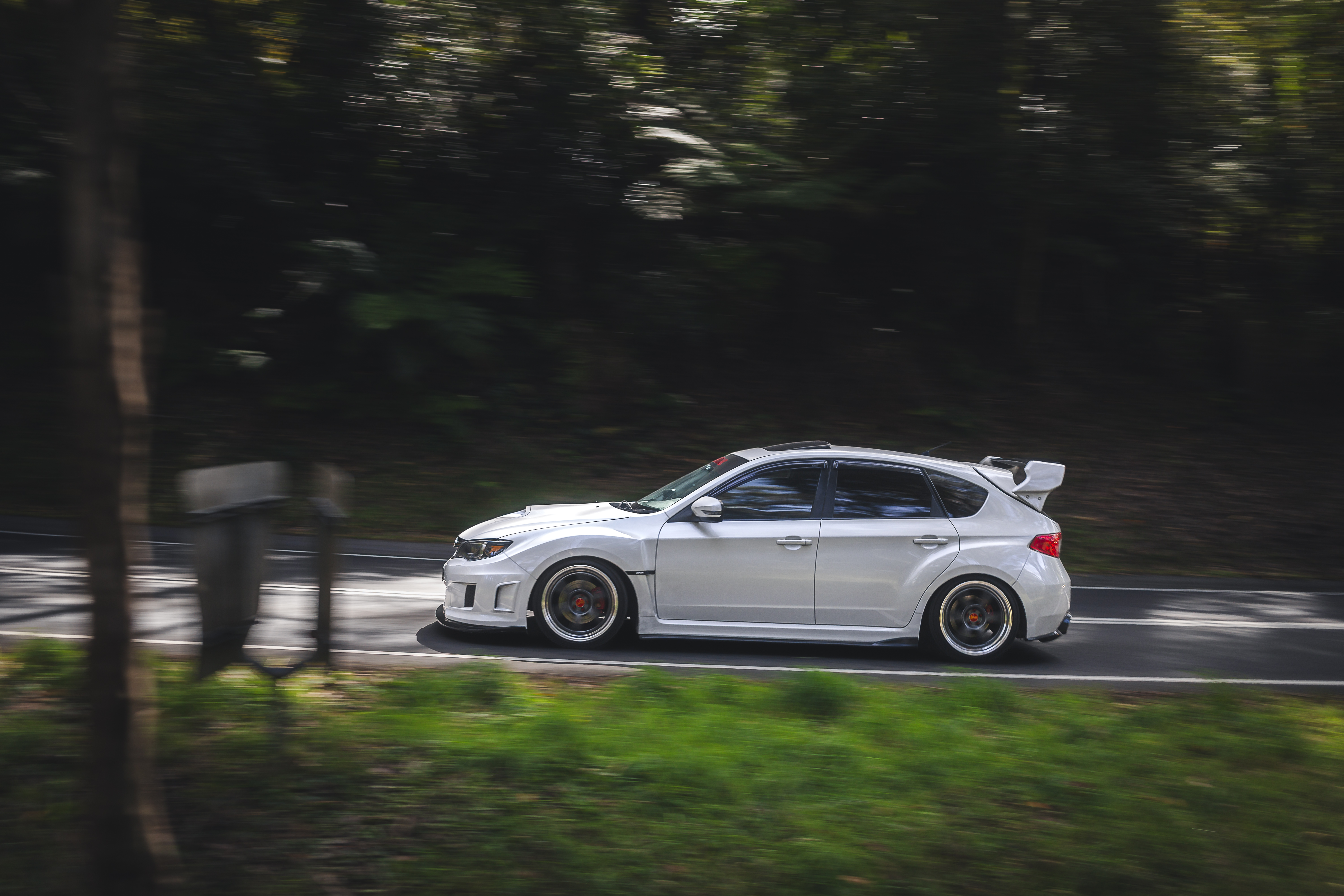 White compact hatchback with aggressive bodywork and red brake calipers driving on a tree-lined road.