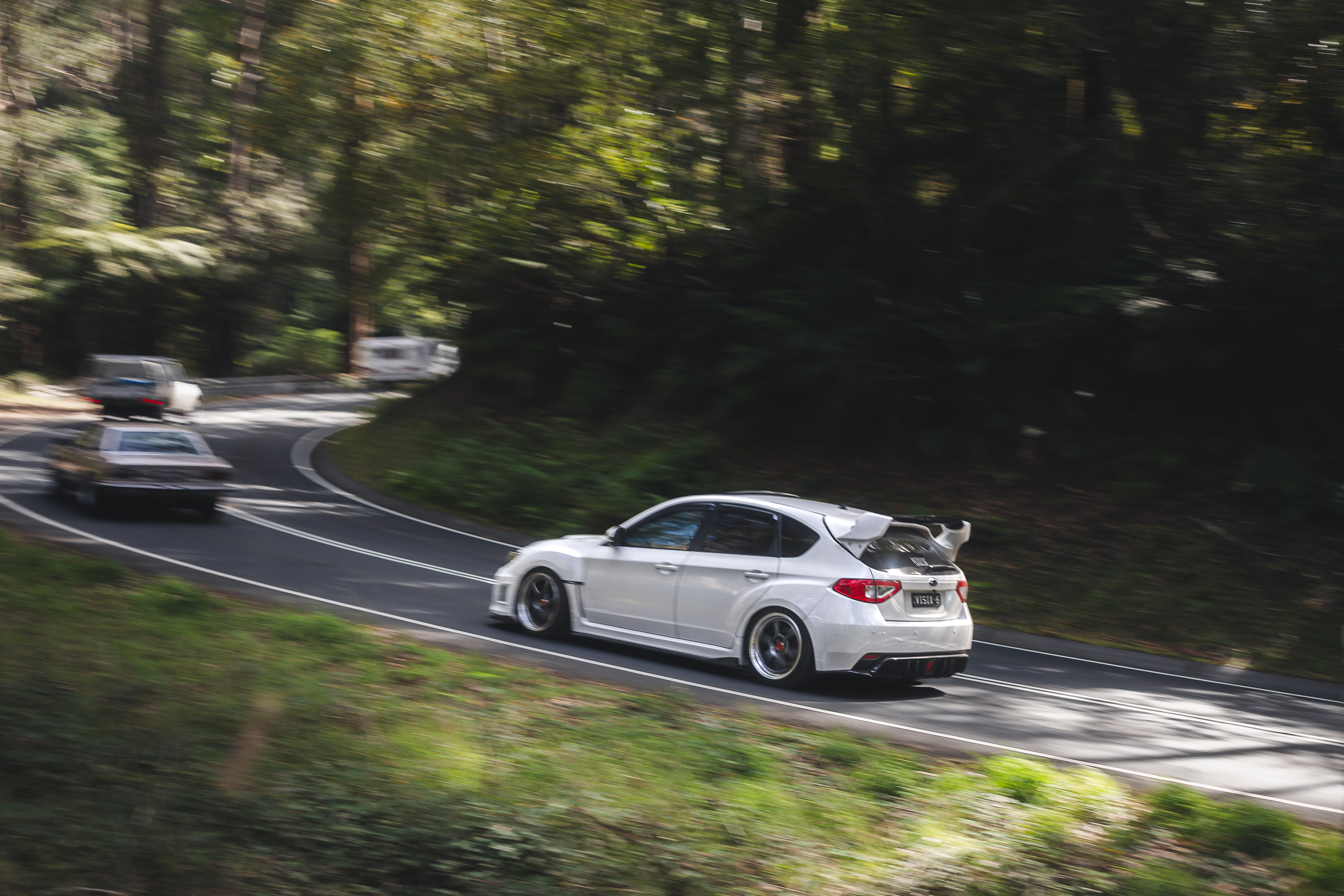 White performance hatchback driving on a curved road through dense forest with other vehicles visible ahead.