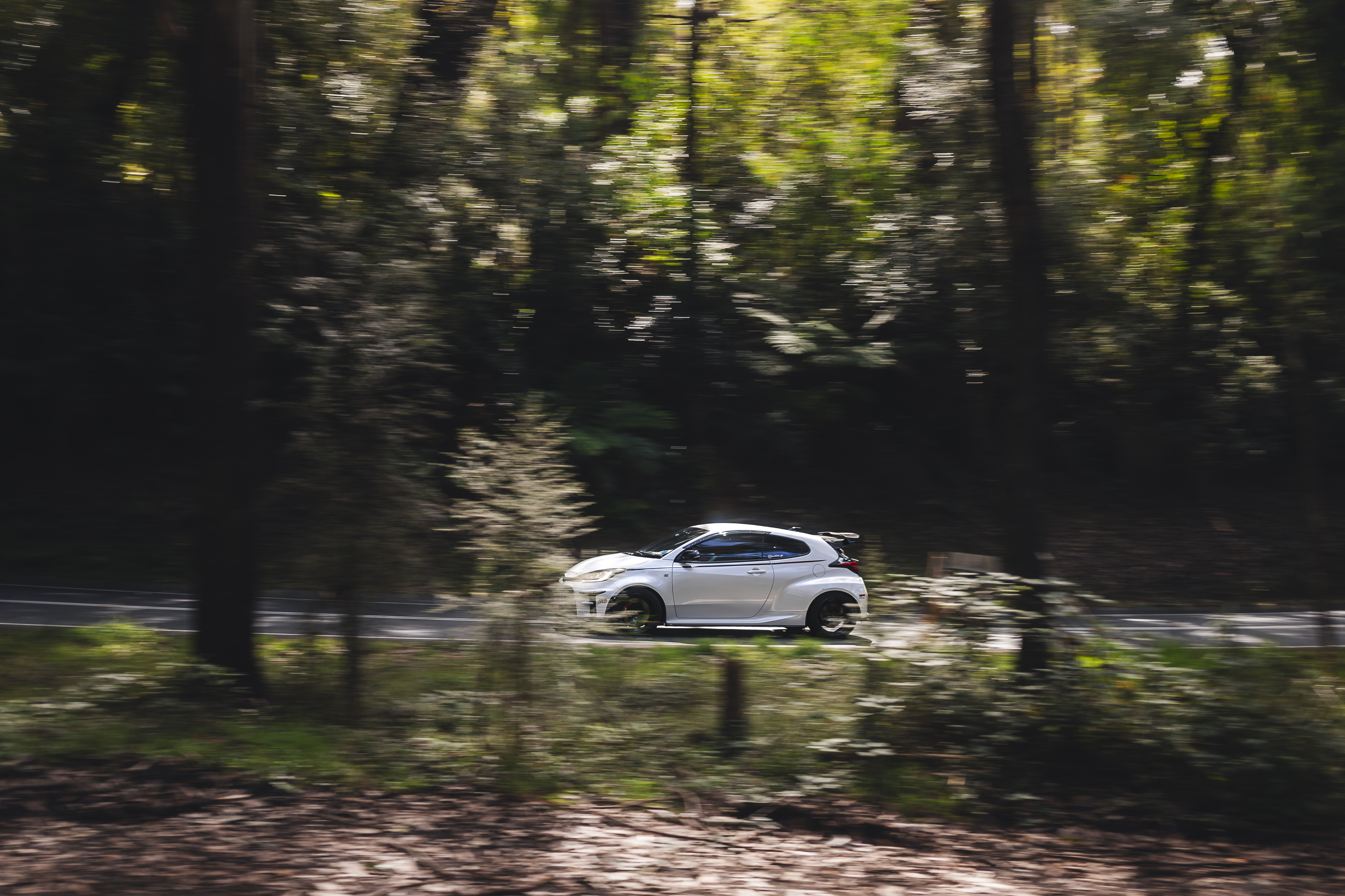 White compact car driving through a tree-lined forest road with motion blur surrounding the vehicle.