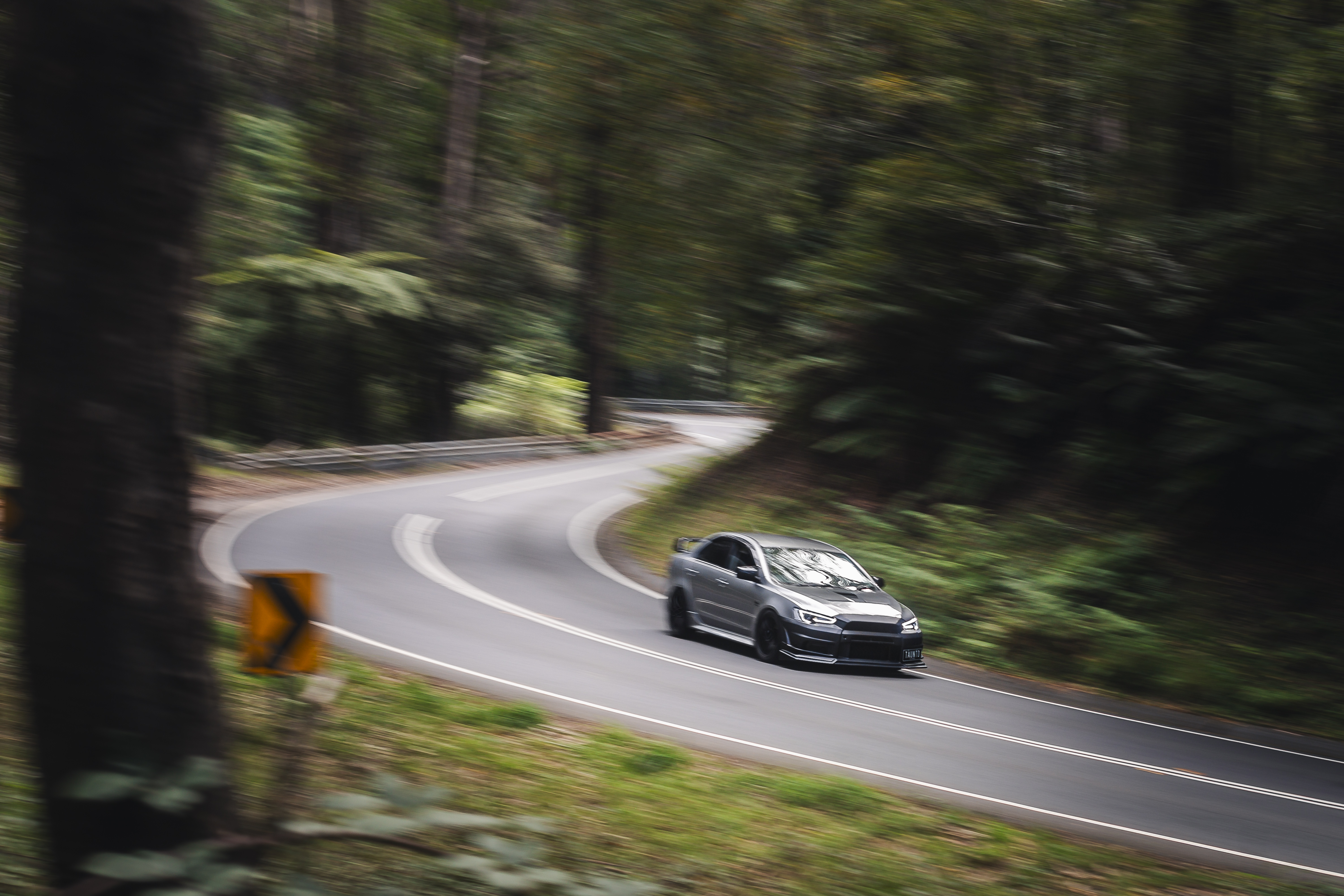 Silver sports car driving on a winding forest road with trees lining both sides.